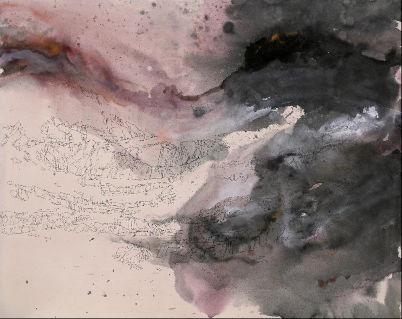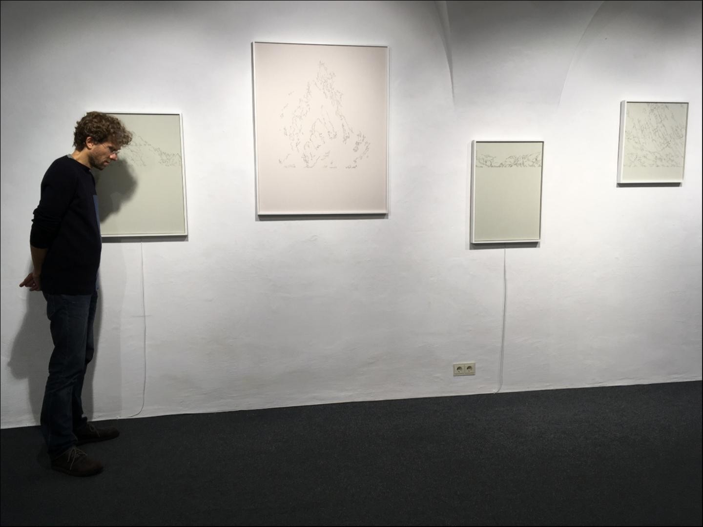Nicole Krenn erweitert die Ausstellung um ihr grafisches Werk. Die Künstlerin setzt sich im speziellen mit Formen der Erosion von Kalkstein auseinander. In ihren Zeichnungen spürt sie den Linien und Rissen im Material Gestein nach und transformiert diese in fragile künstlerische Kartografien. Im kontrollierten Arbeiten mit Tusche auf dem, durch seine Vergänglichkeit bestimmten Material Papier, schafft Nicole Krenn eine mediale Reflexion ihrer Sujets, die durch unendlich langsame, geologische Transformationsprozesse bestimmt sind.