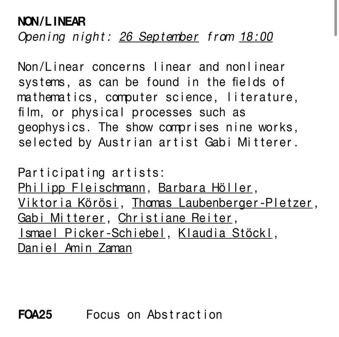 Der Ausstellungstitel NON/LINEAR spielt mit den Begrifflichkeiten der „Nichtlinearität“und der „nichtlinearen Systeme”, die in Bereichen der Mathematik, Informatik und Literatur, im Film oder in physikalischen Prozessen wie beispielsweise der Geophysik zu finden sind.